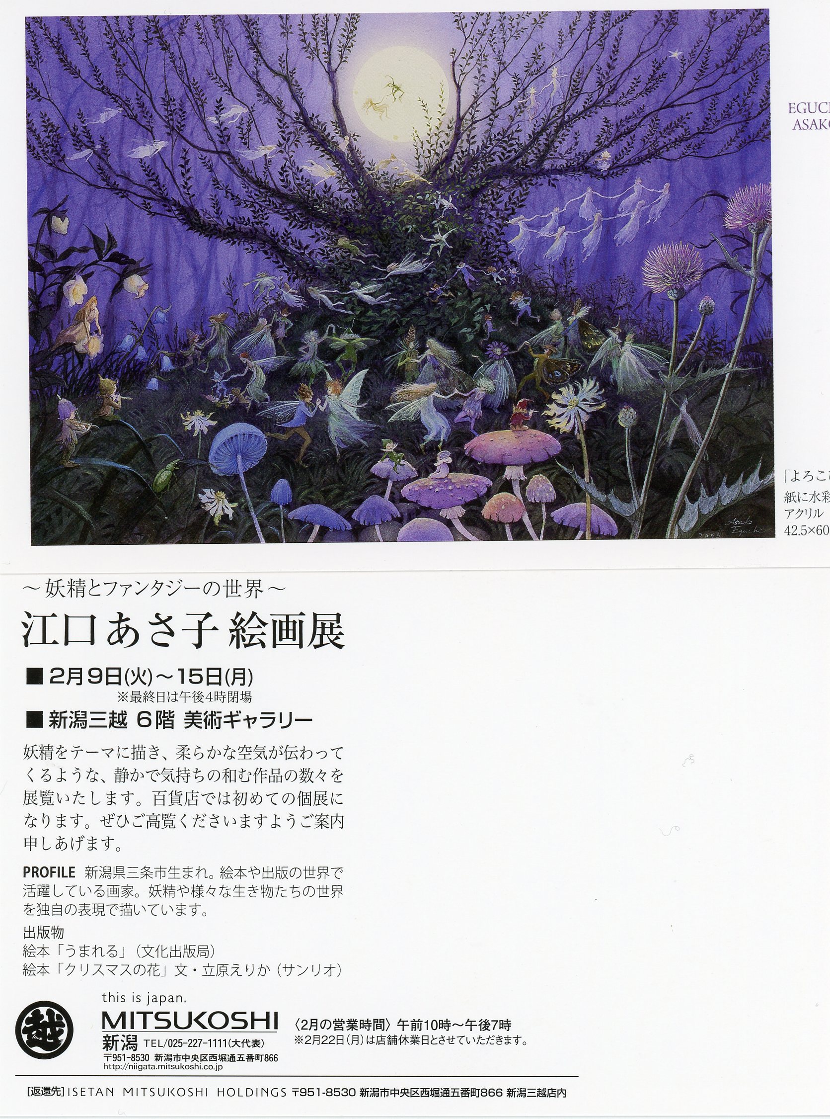 | 江口あさ子絵画展 | | 2016・2月9日(火)〜2月15日(月)最終日は4時閉場 | | 場 所: | 新潟三越美術ギャラリー | | 住 所: | 〒951-8530新潟市中央区西堀通五番町866 | | 電 話: | 025−227-1111 |  |  | 主な出展概要: 1983年から現在までの作品(ファンタジー、妖精画)30点余りを展示いたします。新潟では故郷三条市で1984年に三条市立図書館にて個展を開催させていただいて以来です。この機会に是非、江口あさ子の世界に触れていただけたらと思っております。 |