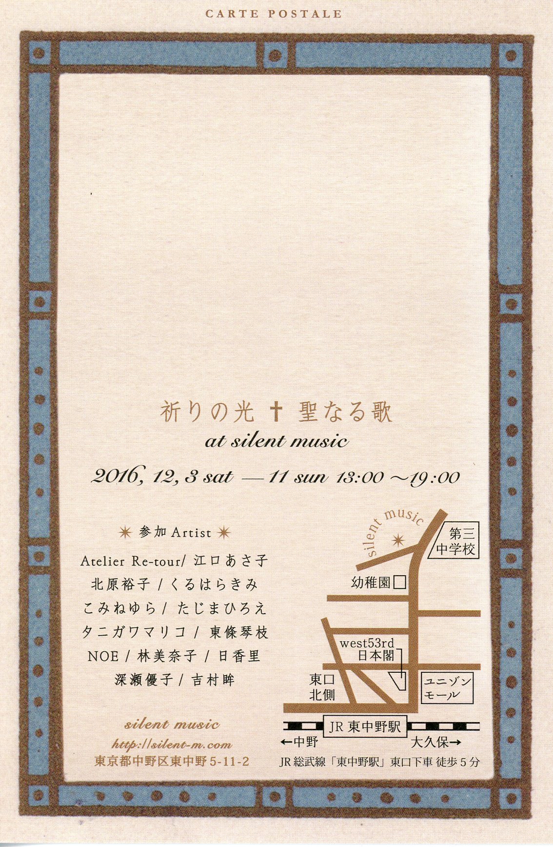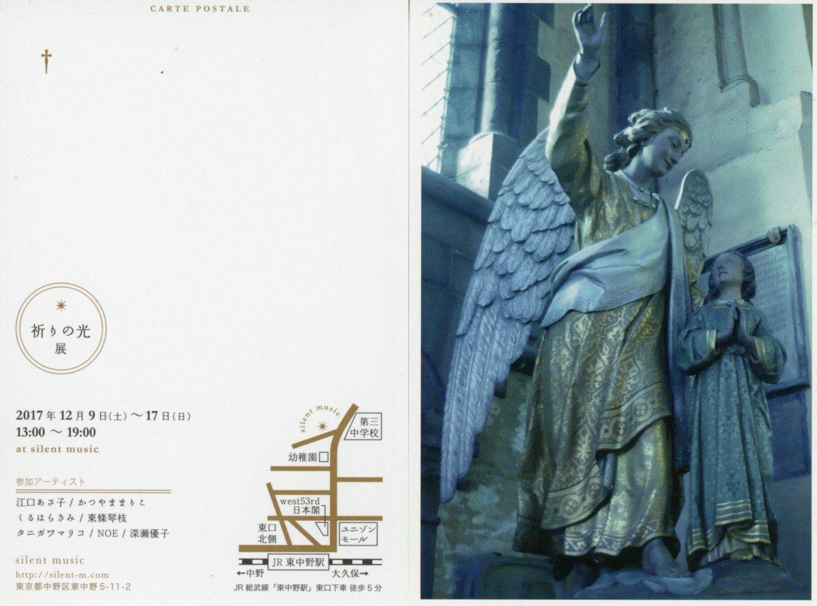 | 祈りの光展 | | 2017/12/9(土)〜12/17 (日) 13:00〜19:00 | | 場 所: | silent music | | 住 所: | 東京都中野区東中野5−11−2 | | 電 話: | 03-3371-7980 |  |  | 主な出展概要: 参加Artist 江口あさ子/かつやままりこ/くるはらきみ/東條琴枝/ タニガワマリコ/NOE/深瀬優子