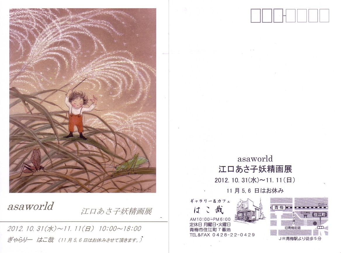 | asaworld 江口あさ子妖精画展 | | 2012/10/31(水)〜11/11(日)10:00〜18:00 11月5・6日はお休み | | 場 所: | ぎゃらりーはこ哉 | | 住 所: | 東京都青梅市住江町7番地 | | 電 話: | 0428−22−0429 |  |  | 主な出展概要: 6年ぶりに青梅のぎゃらりーはこ哉さんで個展を開催させて頂くことになりました。大きめな作品や小作品を20点程展示の予定です。 今年6月に出版された、絵本「うまれる」の原画も数点展示の予定です。 かわいい妖精たちも待っていますよ。