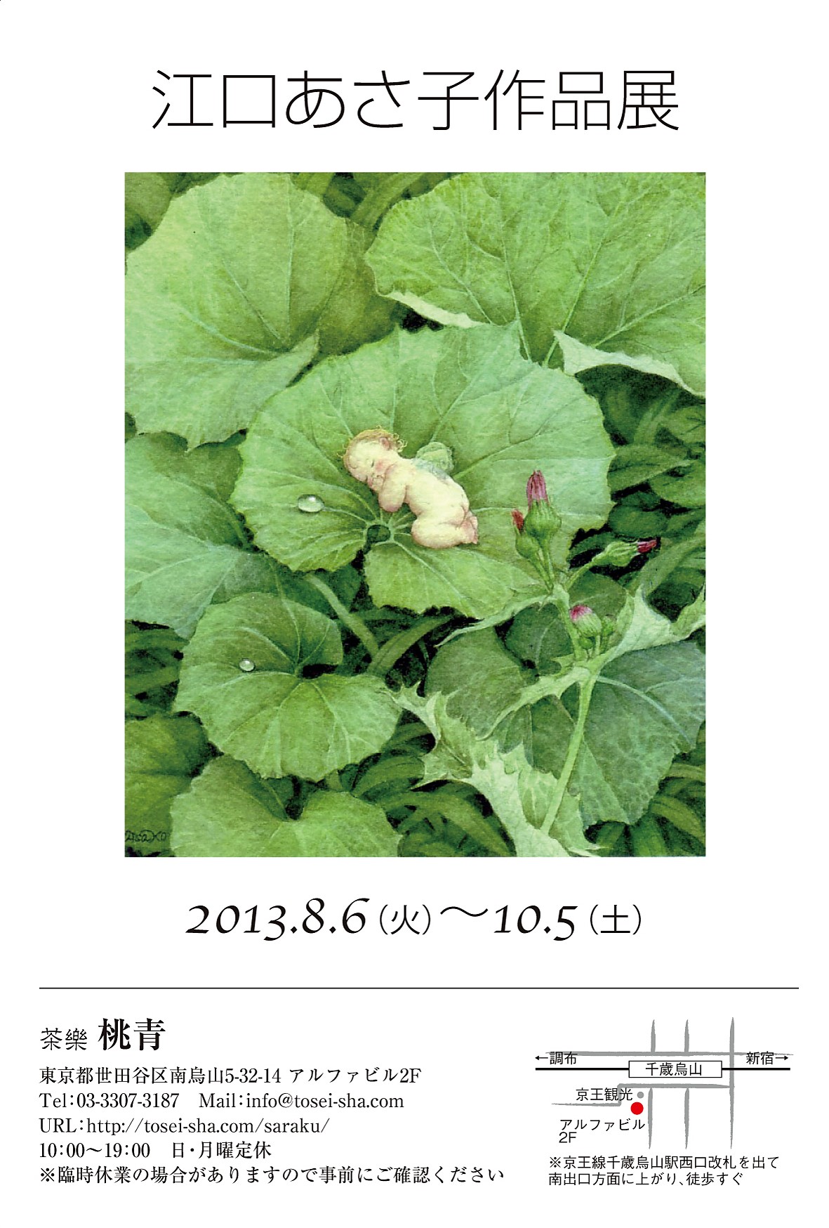 | 江口あさ子作品展 | | 2013/8/6(火)〜10/5(土) | | 場 所: | 茶楽 桃青 | | 住 所: | 東京都世田谷区南烏山5−32−14 アルファビル2F | | 電 話: | 03−3307−3187 |  |  | 主な出展概要: 珈琲の美味しい落ち着いた雰囲気のカフェギャラリー 茶楽「桃青」さんで、約2か月間展示させて頂きます。 原画 銅版画+手彩 ジクレー など 11点ほどの作品を展示致します。