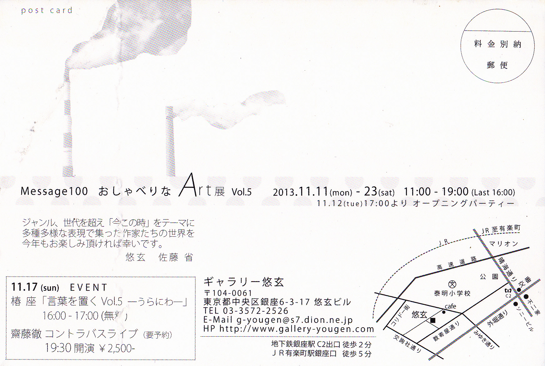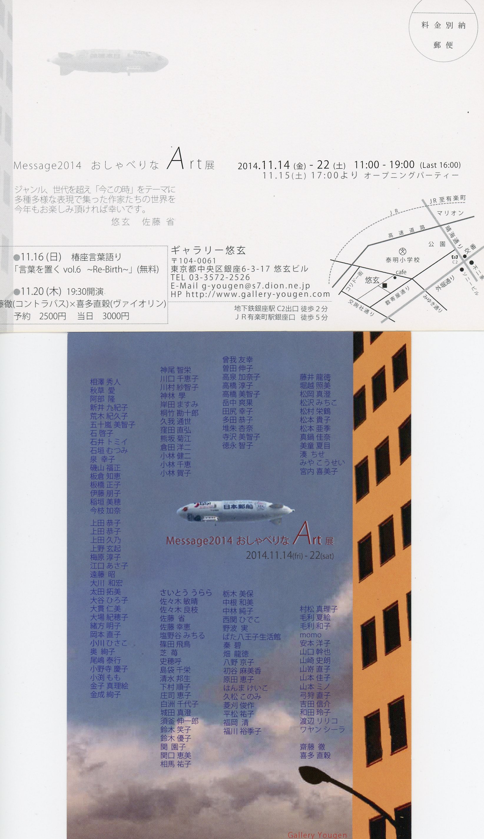 | Message2014おしゃべりなArt展 | | 11.14(金)-22(土) 11:00−19:00(Last16:00) 11.15(土)17:00よりオープニングパーティー | | 場 所: | ギャラリー悠玄 | | 住 所: | 中央区銀座6−3−17悠玄ビル | | 電 話: | 03−3572−2526 |  |  | 主な出展概要: ジャンル、世代を超え「今この時」をテーマに多種多様な表現で集った作家たちの世界。