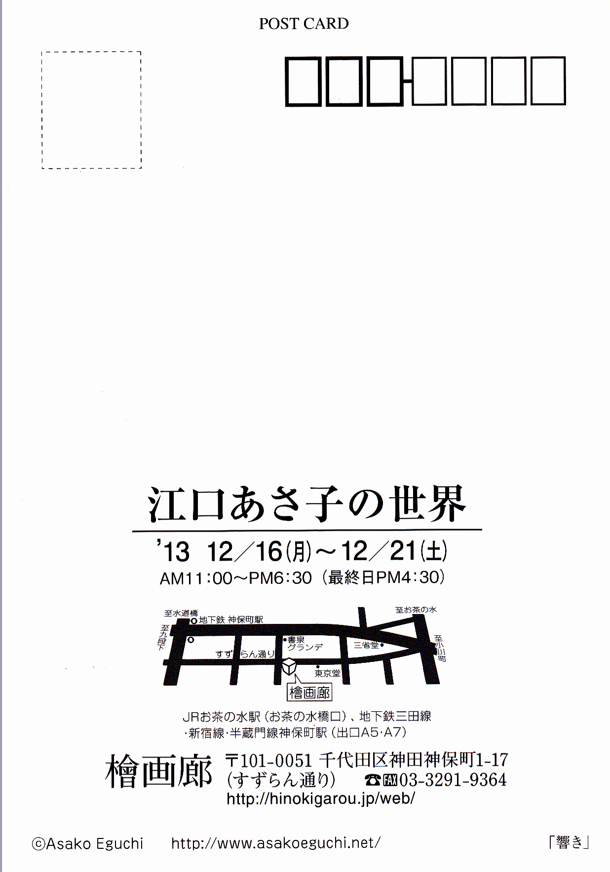 | 江口あさ子の世界 | | 2013/12/16(月)〜12/21(土)AM11:00〜PM6:30(最終日PM4:30) | | 場 所: | 檜画廊 | | 住 所: | 千代田区神田神保町1−17(すずらん通り) | | 電 話: | 03-3291-9364 |  |  | 主な出展概要: 心の中の幻想世界を水彩、アクリル等で表現しました。 大きい作品から小作品まで、20点程展示致します。 |