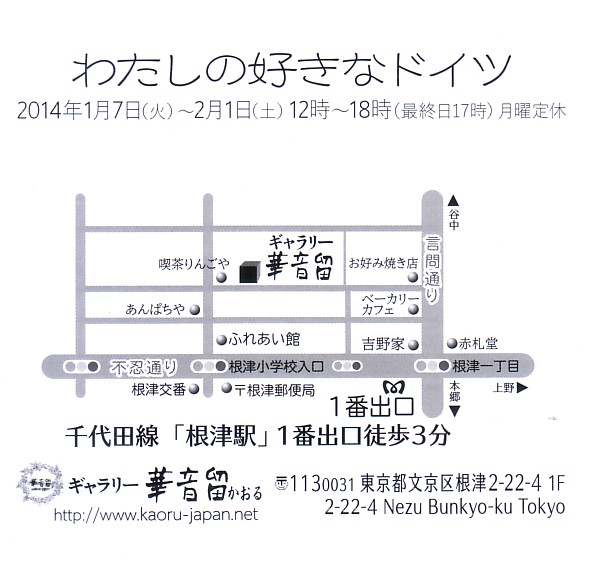 | わたしの好きなドイツ | | 2014/01/07(火)〜2/01(土) 12時〜18時(最終日17時)月曜定休 | | 場 所: | ギャラリー華音留 | | 住 所: | 東京都文京区根津2−22−4 1F | | 電 話: | 090-6103-5030 |  |  | 主な出展概要: ドイツが大好きなオーナーの企画展 いろいろな作家さんのドイツにかかわる、水彩風景画、切り絵、イラスト、磁器、絵皿、陶器のオブジェ 絵葉書などが展示されます。 私は、作品「ロンド」(ジークレー版画)を1点、出展させて頂きます。 |