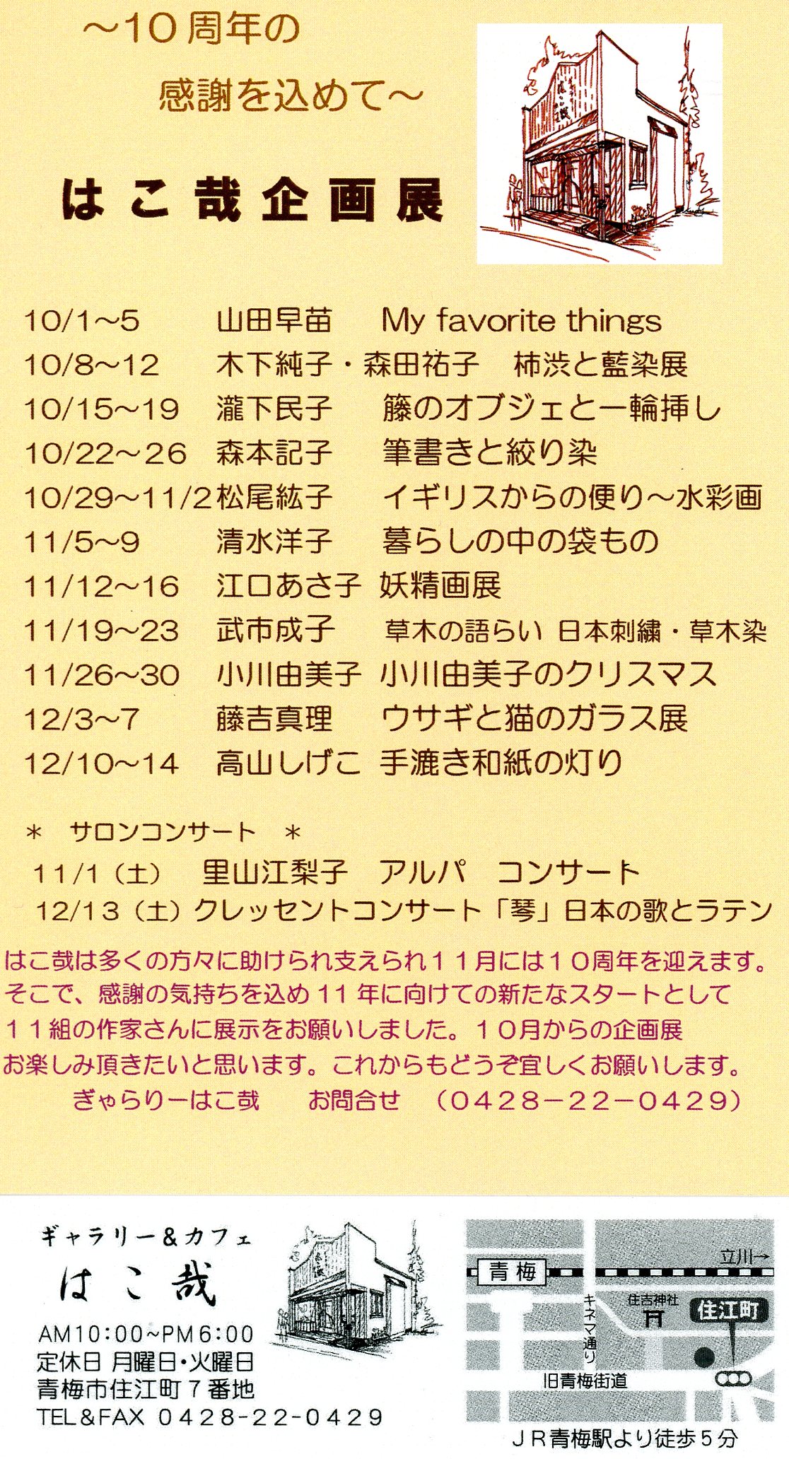 | 江口あさ子 妖精画展 | | 11/12〜16 AM10:00〜PM6:00 | | 場 所: | ギャラリー&カフェ はこ哉 | | 住 所: | 青梅市住江町7番地 | | 電 話: | TEl・FAX 0428−22−0429 |  |  | 主な出展概要: 「〜10周年の感謝を込めて〜はこ哉企画展」 と題して催される、11月に10周年を迎えられる はこ哉さんの企画展です。 10月から12月にかけて11名の作家がこの企画展にて 個展をされます。 私は20作品程、展示させて頂く予定です。