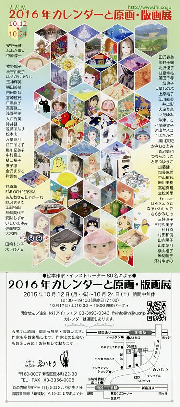 | 2016年カレンダーと原画・版画展 | | 2015年10月12日(月・祝)〜10月24日(土)期間中無休 12時〜19時(最終日17時) 10月17日(土)16時30分〜19時親睦パーティー | | 場 所: | coffee&gallery ゑいじう | | 住 所: | 新宿区荒木町22−38 | | 電 話: | 03−3356−0098 |  |  | 主な出展概要: 絵本作家・イラストレーター80名によるカレンダーと原画・版画展です。問い合わせ先/主催(株)アイエフエヌ03−3993−0343 ifn-info@hh.iij4u.or.jp カレンダーは通販もあります。